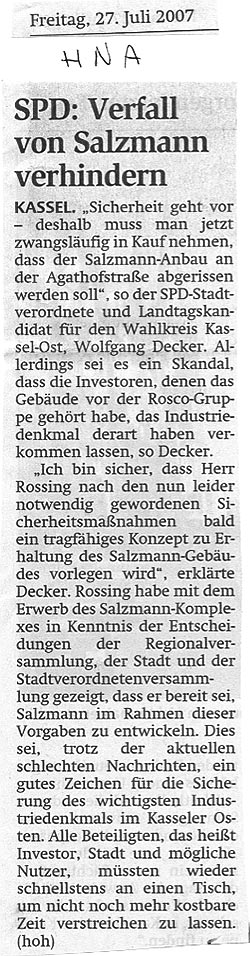 Fabrik SALZMANN & COMP. Kassel / Pressearchiv / 27.07.2007